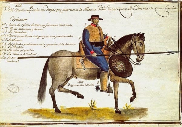 Später, 1778, wurden diese Kompanien mit anderen Soldaten als Cuera Dragoner verstärkt. Es war eine Art leichte Truppe ohne eindeutige Nummer, die kein Leder trug und Pistolen, Säbel und Karabiner benutzte.
