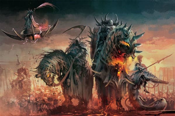 Zwei schwarze Pferde von übernatürlicher Größe ziehen die Chaoswagen. Sie sind mit Stahlplatten bedeckt und ihre Augen und Schnauzen sprießen höllisches Feuer.