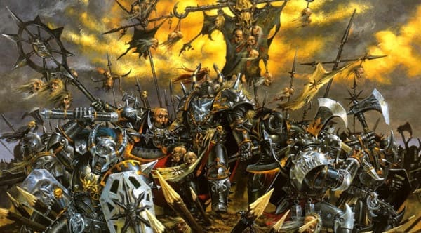 Die Rüstung der Chaos-Krieger ist in der Hölle geschmiedet und so stark, dass Pfeile sie nicht durchdringen können, ebenso wenig wie Hellebarden oder Äxte.