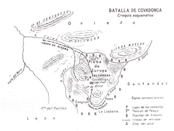 In Kenntnis seiner zahlenmäßigen Unterlegenheit entschied Don Pelayo, dass sie auf die muslimischen Truppen warten würden, die in der Höhle von Covadonga versteckt waren, damals Cova Dominica, im Tal der Cangas de los Picos de Europa, das wegen der Anwesenheit des Monte Auseva keinen Ausgang hatte.