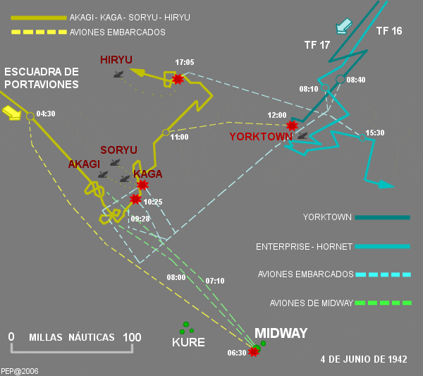 In der Zwischenzeit, um 7:00 Uhr morgens, schickte Admiral Fletcher bereits die Flugzeuge, um die japanischen Flugzeugträger anzugreifen. Spruance hingegen befahl, mit allem anzugreifen, ohne darauf zu warten, dass alle Flugzeuge in der Luft sind, um einen koordinierten und gemeinsamen Angriff zu organisieren, entgegen dem, was Nagumo beschlossen hatte.