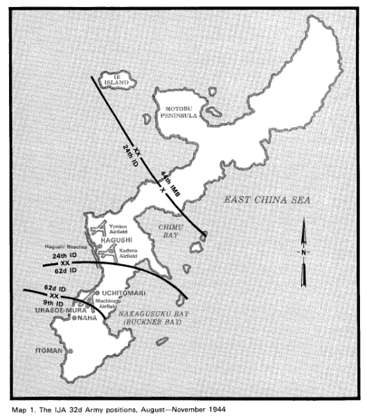Die japanische Armee, die zur Verteidigung Okinawas eingesetzt wurde, bestand aus 9.000 Soldaten der japanischen Reichsmarine und 67.000 Soldaten der 32. Armee .